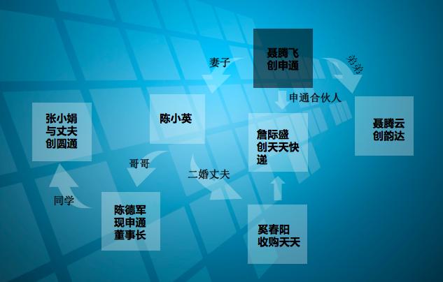 申通是桐庐帮的黄埔军校。申通创立第二年,合伙人詹际盛出走,和弟弟一起创立天天快递。只是故事峰回路转,几年之后,聂腾飞的妻子陈小英和她二婚的丈夫一起,收购了天天快递,随后又将它卖给苏宁。