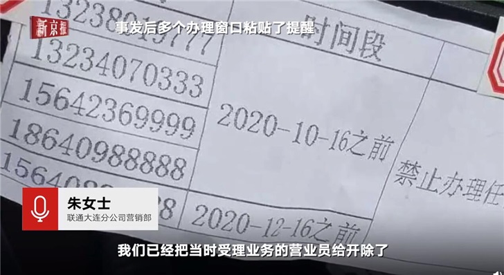 对于大连市公安局西岗分局所说的法律文书,朱女士表示2018年10月16日就发给联通公司了,“系统(对过户)限制不了,法院给我们来函,我们只能告诉营业员,这些号码法院是不允许过户的,那个营业员忘了或者是那一瞬间忘记了,就给办理了过户业务。就是营业员失误造成的这个问题,我们已经把那个当时受理业务的营业员给开除了。”