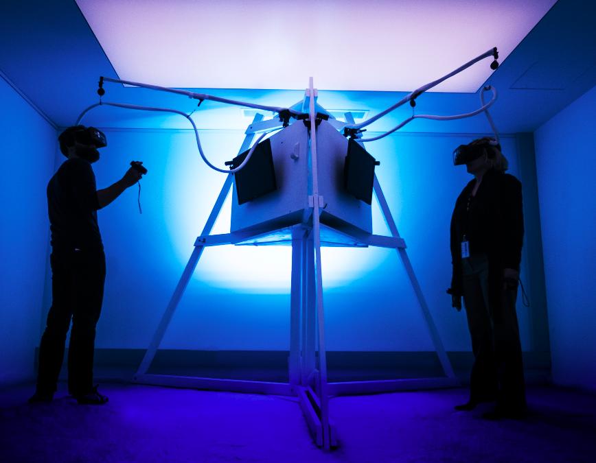 * 其次,他们抛弃了传统手柄,通过「势能操作」实现移动,体验者只要做出行走移动的趋势姿态就能完成VR世界中的自然移动而不需要真正迈步行走。