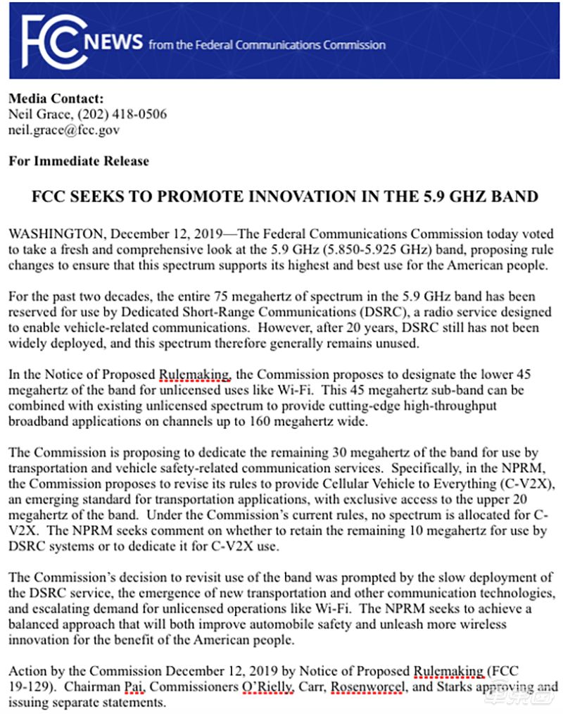 车东西12月13日消息,今日,美国联邦通信委员会(FCC)一致投票通过了一项提案,该提案将重新分配5.9 GHz频段的75MHz频谱,其中一部分将用于C-V2X技术。V2X通信有两大技术路径,一个是基于蜂窝网络(即手机使用的网络)进行通信的C-V2X技术,另一个是基于Wi-Fi改进来的DSRC技术。前者覆盖面大,通信距离远,无需额外组网即可通信,后者仅可在短距离进行通信。