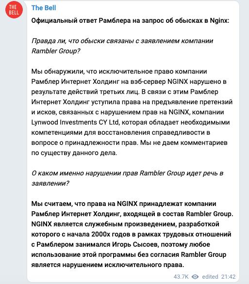 Rambler 集团表示,自 2000 年初以来,Igor Sysoev 所完成的开发工作均属于其与 Rambler 的劳资关系框架内,因此未经 Rambler 集团同意,其他主体对本程序的任何使用均侵犯了专有权。