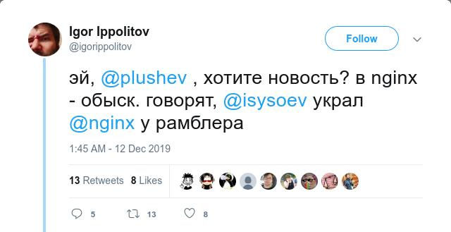 最早爆出这个消息的是 Nginx 的一名员工,他在一条推特中称:公司的两位创始人 Konovalov 和 Sysoev 被带走了。同时他表示,情况正在审查中,其他人员目前没有被拘留。
