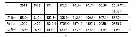 在上图中,快递每单均价由高点的18.5元降至11.8元,且从2016年开始,降幅明显收窄,2019年前11月与上年平均值几乎未有太大变化。