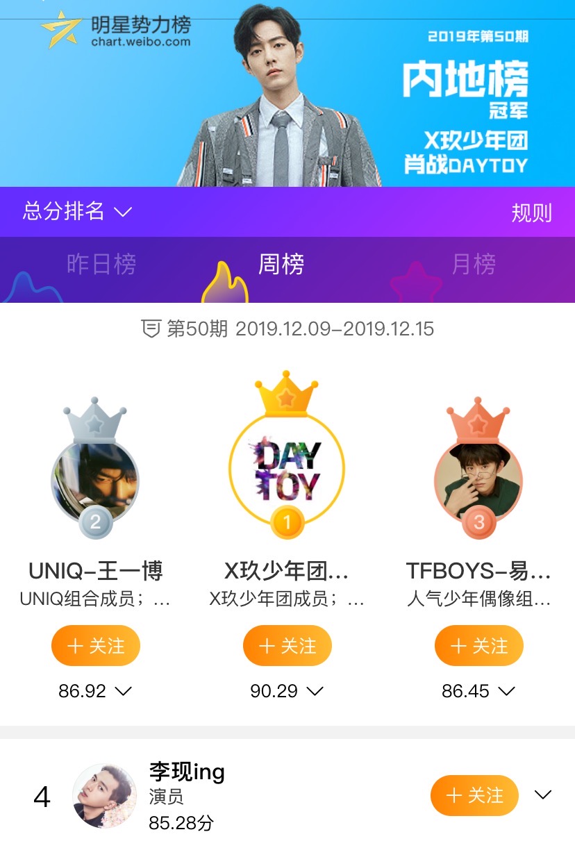 据微博明星势力榜内地周榜显示,肖战、王一博、易烊千玺位列前三位,李现暂居第四。