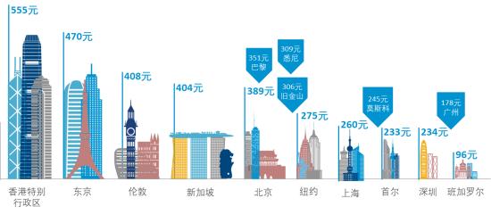 从全球主要城市甲级写字楼租金水平来看,香港依然是全球最贵的写字楼市场,北京和上海已经跻身全球最昂贵的写字楼市场的前列,仅次于东京,伦敦和新加坡。