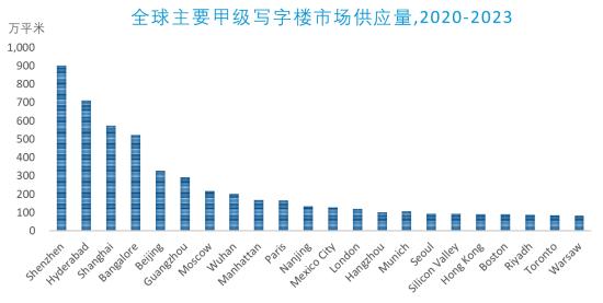 令人庆幸的是,从全球主要城市的甲级写字楼未来供应水平来看,在未来5年内,新兴经济体将主导全球甲级写字楼未来的供应格局。中国,印度和俄罗斯成为全球写字楼市场的主要未来供应来源。深圳的甲级写字楼供应领跑全球,而且中国的四个一线城市全部上榜。同时,主要的二线城市如武汉,南京和杭州,都有较大的写字楼未来供应。