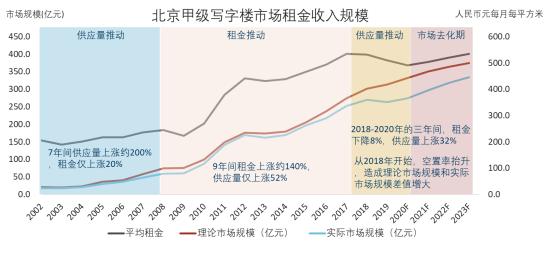纵观北京甲级写字楼市场发展的历史,整体租金收入规模从2002年的大约30亿元左右,增长到2019年的大约420亿元,18年间增长大概14倍,预计到2023年整体理论市场规模将达到500亿元。从市场历史增长的潜在动力来看,基本可以分为三个阶段:第一阶段是从2002年到2008年,主要动力来自于供应量提升,7年时间供应量增长约200%,但租金增幅只有20%;第二阶段是从2009年到2017年,这个阶段的规模推动主要来自于价格上涨,9年间租金涨幅约140%,供应量上涨只有50%左右;第三阶段也就是从2018年开始到2020的第二轮市场供应高峰,供应量预计超过30%,但租金处于下降通道中。