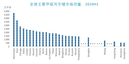 从全球甲级写字楼市场存量来看,全球主要城市的甲级写字楼存量大部分都集中在欧美发达经济体的核心城市,纽约曼哈顿,巴黎,芝加哥,达拉斯,伦敦,多伦多,慕尼黑等。这也从一定程度上反映出经济发达的城市对于写字楼发展有着很强的推动作用。或者说,从供给侧结构性改革的角度来看,整体经济从工业化向服务业转型的过程中,市场对于高品质写字楼有着极强的需求,或者说高品质写字楼是服务型经济体发展所需的重要基础设施。