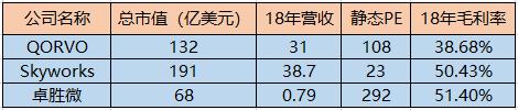 卓胜微虽然成长更快,空间很大,但从18年数据看,其营收分别只有QORVO和Skyworks的2.5%和2%,但目前市值却分别是QORVO和Skyworks的51.5%和35.6%。