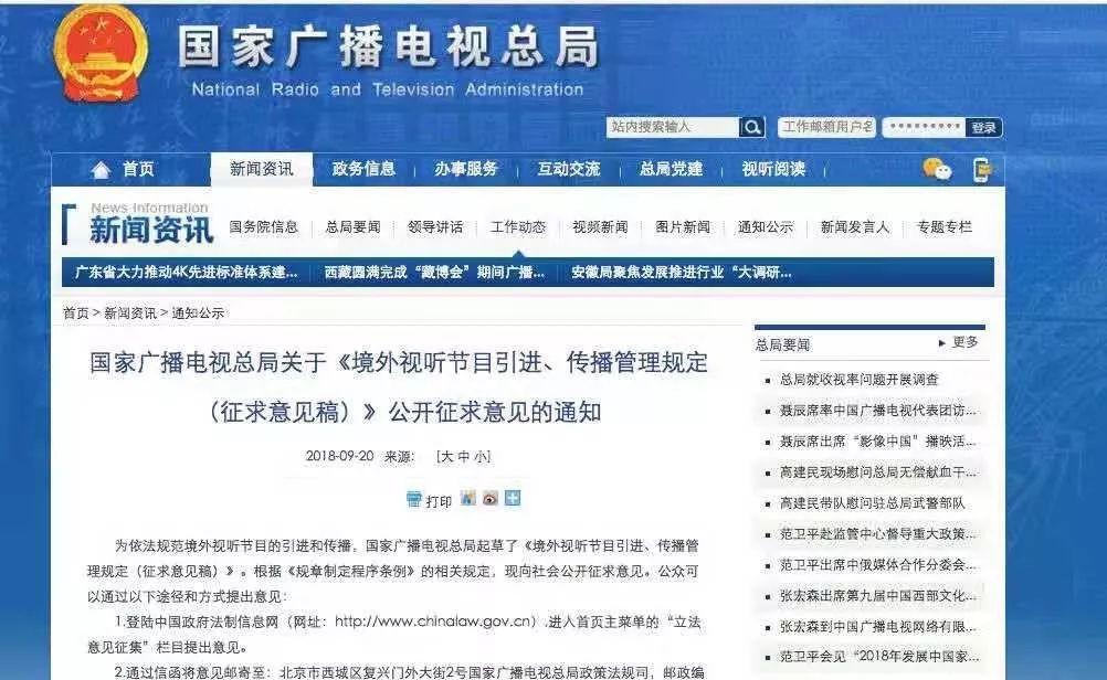 2018年9月,国家广播电视总局起草了《境外视听节目引进、传播管理规定(征求意见稿)》(回顾:《广电总局发布境外节目规定,网络平台引进动画数量等或将受管理》),里面针对“引进境外节目”提到了“许可制度”、“境外作品不得超过该类别总量的30%”、“内容审核规定”、“管理责任、法律责任规定”等。