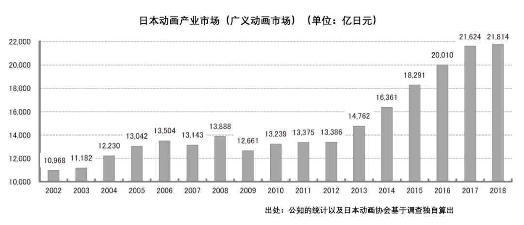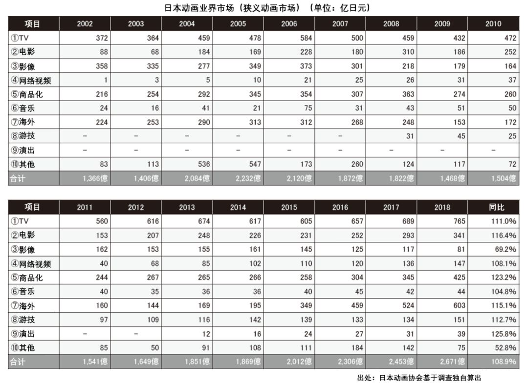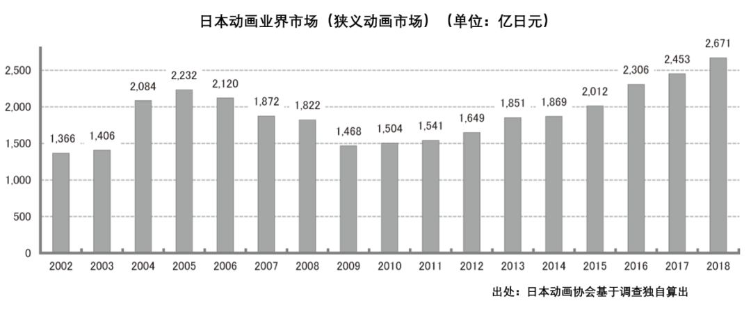 根据日本动画协会独自统计,2018年日本动画业界市场规模达2671亿日元(170.64亿元人民币),同比增长8.9%,并实现了9年连续刷新最高值。