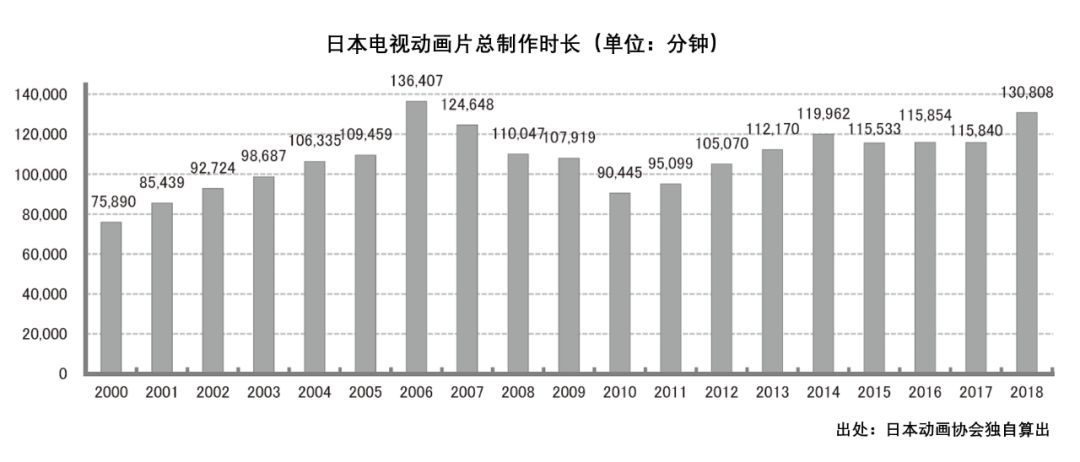 增长的14968分钟,相当于在电视播出10部每集30分钟的50集(播1年)长篇系列动画片。这其中并没有包含在Netflix等网站独占播放的动画片,如果把那些网络原创动画系列作品也算上的话,或许有可能超过2006年的巅峰 136407分钟。