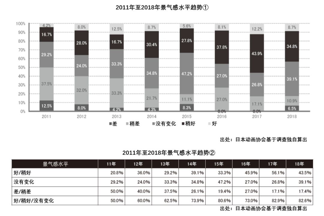 为了更明显地反映数据,日本动画协会还制作了“景气感水平趋势表”。如下图所示: