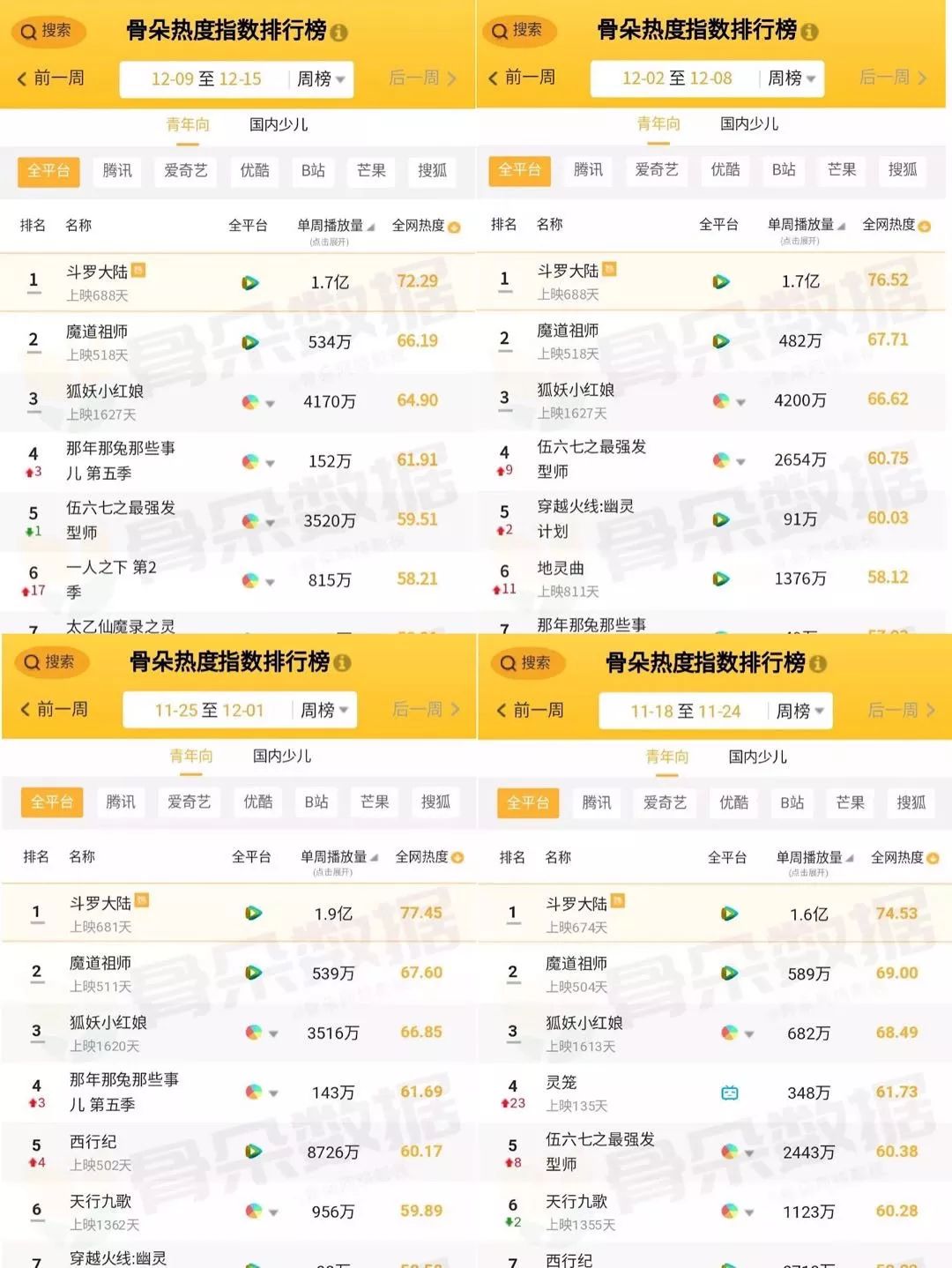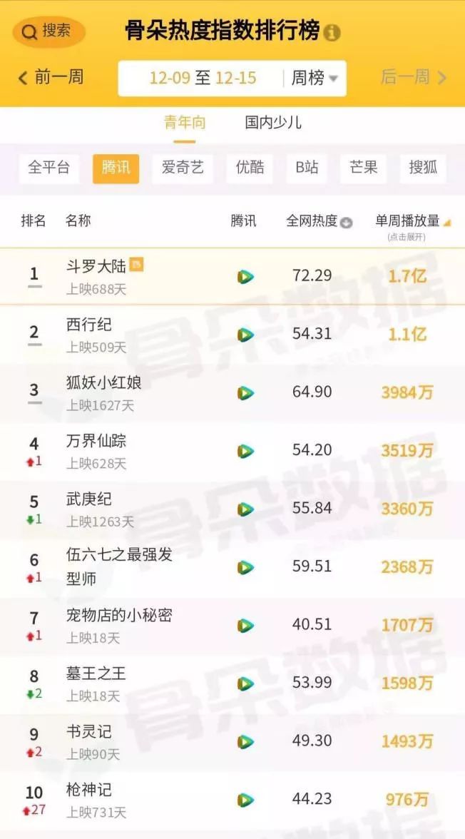你说年轻用户是善变呢,还是长情呢?眼见着2019年影视圈、明星圈都是城头变幻大王旗。而国漫领域的热度TOP3几乎就没变过:已经上映超过600天的《斗罗大陆》、上映超过500天的《魔道祖师》,以及上映1600多天的《狐妖小红娘》。