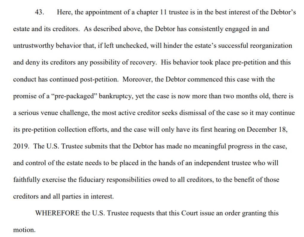 12月11日,U.S.Trustee 公开一封言辞激烈的意见书,支持懒财等债权人的诉求。