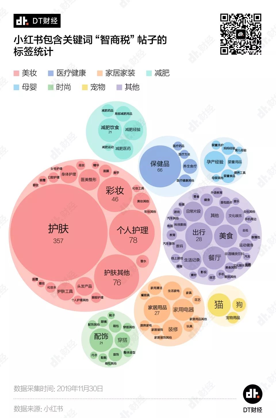 我们首先统计了小红书全部带有“智商税”关键词的笔记中,点赞数最多的1000条发文。结果显示,人们在小红书上晒出的智商税,主要集中在美妆、家装、宠物等几大类别。