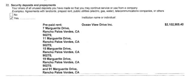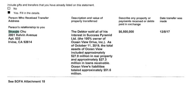在贾跃亭的破产申请文件中披露,他在2017年12月8日向Shaojie Chu以650万美元的价格,出售了Ocean View的100%持股母公司Success Pyramid。截止到2019年10月11日,Ocean View的全部资产包括约2790万美元的房地产和2730万美元的应收贷款。Ocean View的债务总额为5160万美元。