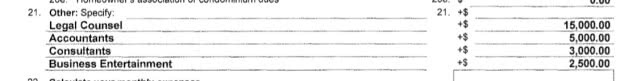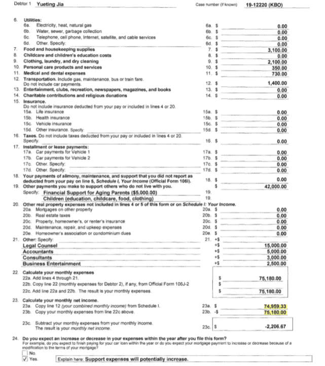 贾跃亭在破产申请文件中披露,每月支付律师费1.5万美元,会计师费5000美元,咨询费3000美元以及商务娱乐费2500美元,债务托管人以“提交破产申请后,不允许破产申请人在未经法院批准的情况下,支付任何律师、会计师等专业人员费用”这条规则,对贾跃亭进行相关质询。