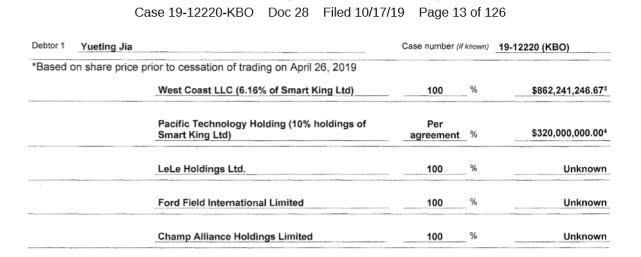 贾跃亭破产申请文件中披露持有West Coast 100%股权,后者又持有Smart King 6.16%股权,并指出这部分股权价值为8.62亿美元。