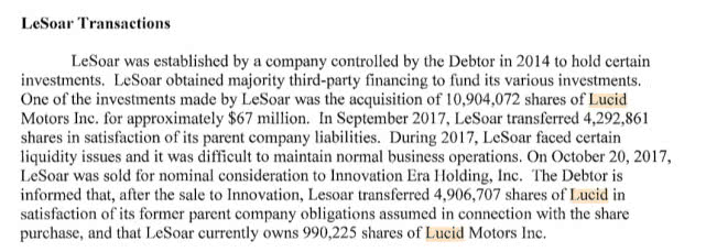 (接下来问题涉及到Lucid电动车初创公司,贾跃亭曾通过LeSoar向Lucid投资6700万美元,获得10904072股,2017年9月,LeSoar转让4292861股用于母公司债务,2017年,LeSoar出售给Innovation Era Holdings,并又转让了4906707股用于母公司债务偿还,目前LeSoar还持有Lucid Motors 990225股。)