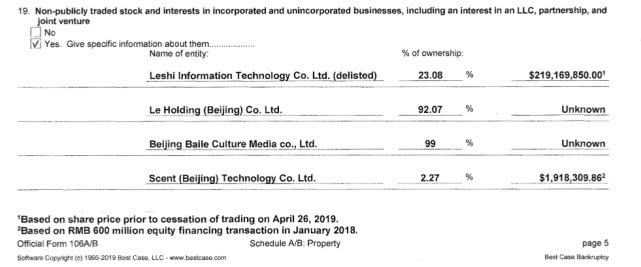 贾跃亭破产申请文件中披露,持有Le Holdings 92.07%的股权,但价值未知。