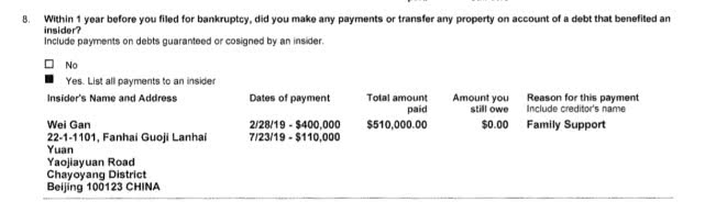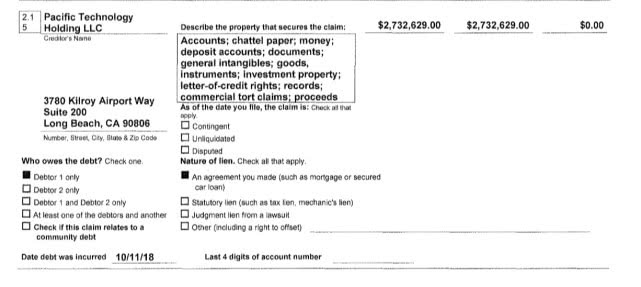 (贾跃亭披露在破产申请提交的前3天,Pacific Technology向其贷款了273万美元,但披露文件中日期发生错误,实际应为2019年10月11日,而非2018年10月11日)