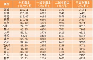 诸葛找房数据则显示,今年第50周,北京一居室租金为5590元/平方米,两居室租金为6691元/平方米,三居室租金为10651元/平方米,环比前一周均出现不同程度的下跌,其中三居室跌幅最大,达1.12%。其中,西城区的租金均价依然最高,为130.11元/平方米/月;其次为东城区,租金均价为125.82元/平方米/月;海淀区租金均价为112.02元/平方米/月,位居第三。