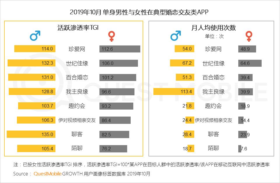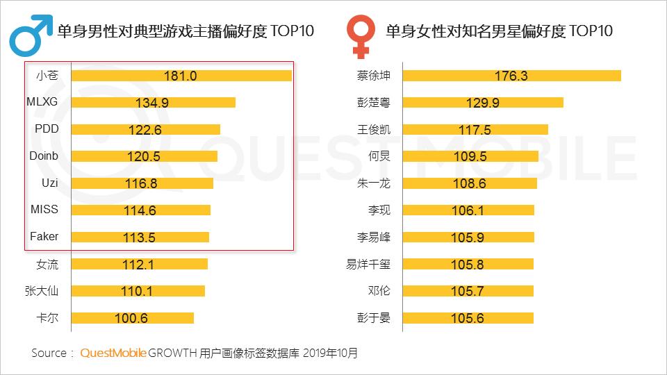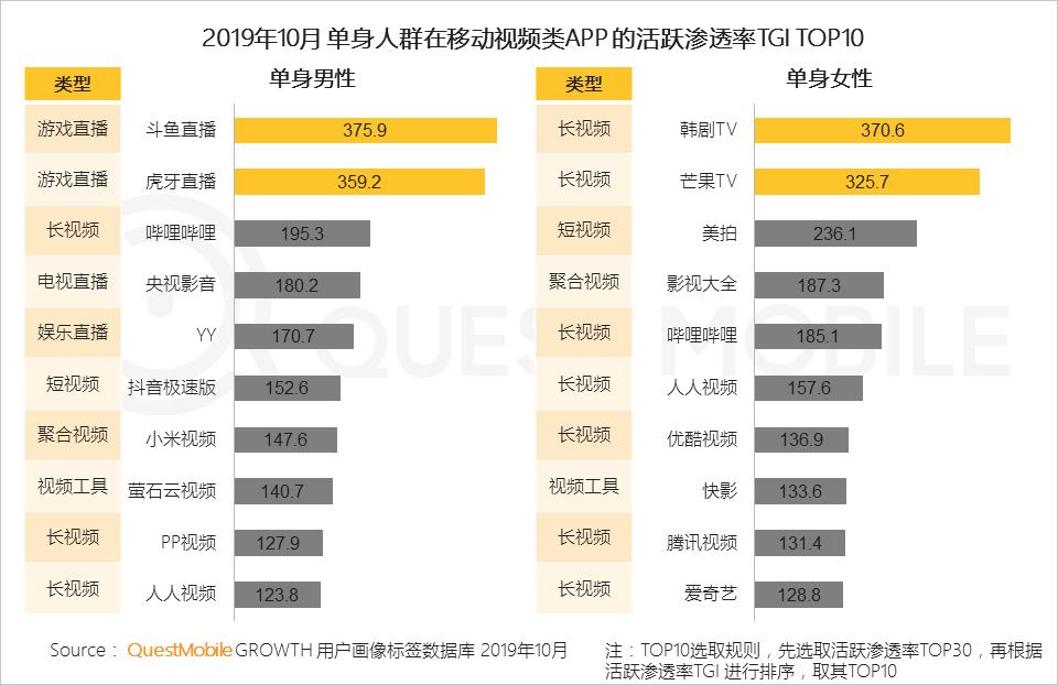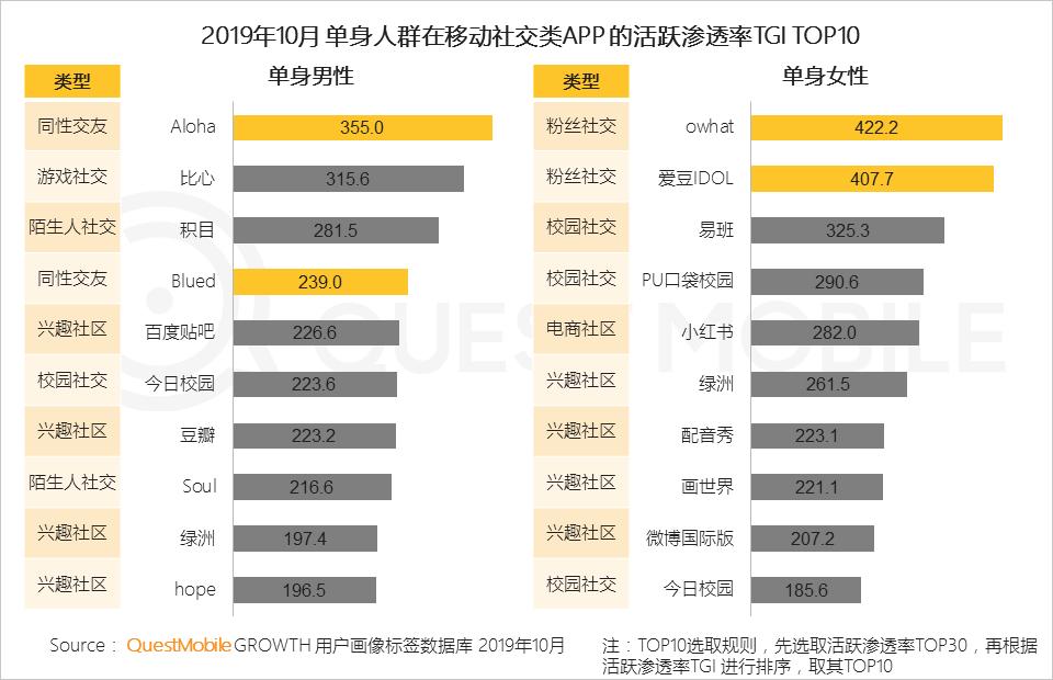 再告诉大家一个不幸的消息:相比男性更喜欢用社交类(包括同性社交,Aloha、比心、积目、Blued、百度贴吧等位居偏好度前列)、直播类(斗鱼、虎牙杠杠靠前,不亏直男),女童鞋普遍更喜欢偶像类交友(owhat、爱豆IDOL、易班、PU口袋校园、小红书位居偏好度前列)、偶像追剧类(韩剧TV、芒果TV、美拍),在婚姻选择上,女童鞋更慎重,这些都助推了单身经济……