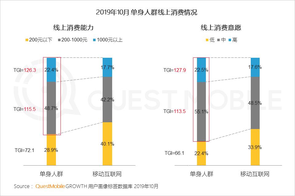 当然,对于商家和移动APP服务上来说,仅仅关注这个还是不够的,毕竟,从数据上看,单身人群线上消费意愿、消费能力都远高于整体人群,怎么搞定他们呢?不妨看报告吧。