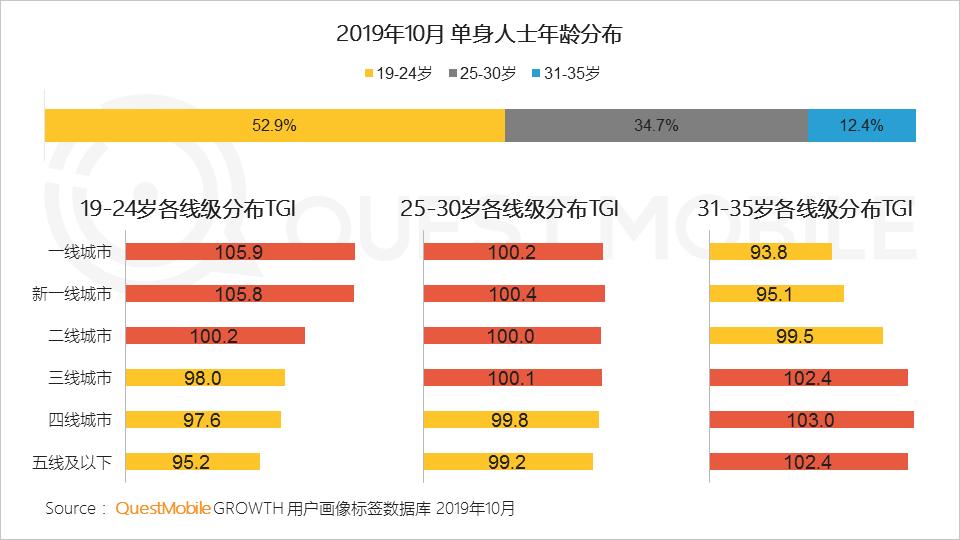 QuestMobile数据显示,家庭规模缩小已经成为趋势,第五轮单身潮来临,各年龄段单身人群构成,城市等级越高,单身越低龄,一二线城市,24岁以下单身的更多,到了三四五线城市,31岁以上年龄用户更容易单身。对于这个的一个解释是,一二线城市普遍学历更高(包括外地来一二线城市念大学的),所以往往需要毕业之后才会结婚;三四五线城市结婚更早,但是离婚也更早,不愧是人生赢家,学生狗还在苦逼哈哈单身念书,这边已经离婚潇洒去了……
