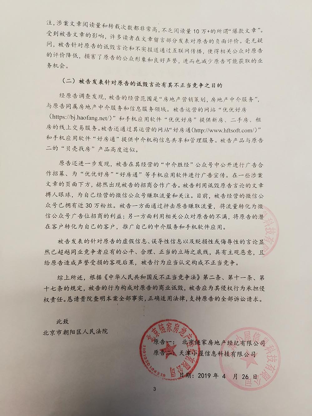链家、贝壳在起诉书中称,好房通通过“中介胜经”微信公众号持续发表和传播诋毁链家、贝壳声誉的文章,链家、贝壳称好房通发布这些文章意在赚取流量为广告位招商获利,同时利用公众对原告的不满,将原告的潜在用户转化为自己的客户,此举已超出同业竞争的底线。