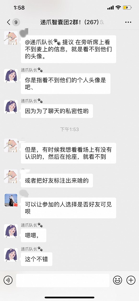 目前递爪设置的官方微信群多达十余个,每个群都设置有3-4名递爪一线的运营人员,而每个递爪用户都可以申请加入微信群。用户可以在群聊中对软件功能、话题设置提出自己的意见,而递爪队长(运营人员)也会实时进行沟通。