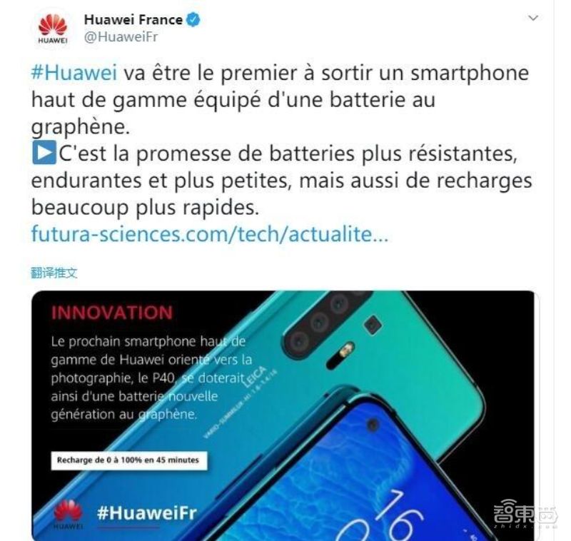 据外媒报道,华为法国官方Twitter帐户近日发布推文,称“华为将是第一家推出带有石墨烯电池的旗舰手机的公司。”该推文带有P40 Pro的疑似渲染图,并有文字突出显示“仅需45分钟即可充电100%”。
