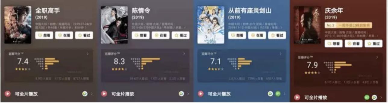 经历了寒冬和行业调整期,平台和影视制作方也在进行尝试和试错。在持续修内功补短板后,2019年终是迎来了新变局,《全职高手》《陈情令》《从前有座灵剑山》《庆余年》等剧在热播的同时口碑也稳定在了7分以上。