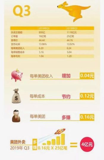 用“开源节流”方式去“降本增效”,从美团2019年Q3财报数据上也侧面证明了这一点:餐饮外卖作为美团的基本盘,美团在2019年第三季度送出25亿外卖订单,其餐饮外卖收入占比总营收56.7%,GMV从2018年800亿增长至1119亿,客单价从2018年的44.44元增长至44.76元。