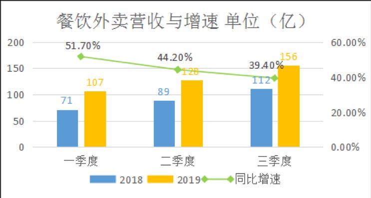 2019年,美团Q3餐饮外卖业务的营业收入达156亿元,同比增长39.4%。不过,值得注意的是,虽然三季度餐饮外卖收入仍在增长,但通过财报,不难发现该业务同比增速在逐渐下滑。