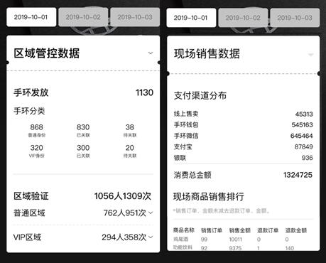 赵晓楠告诉36氪,在为主办方工作人员提供的小程序版本中,拥有实时数据报告,可以看到用户基于智能手环产生的进出场记录以及消费记录等可定制化数据,主办方可以随时评估场内人流情况以及消费品消耗情况。