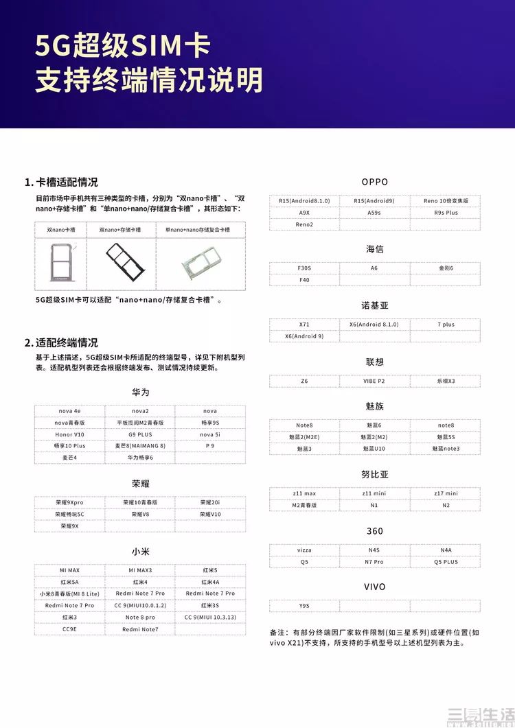 其次,“5G超级SIM卡”不光要求手机支持TF卡,而且还要求手机必须是采用与或卡槽设计——也就是那种第二个SIM卡必须是和TF“二选一”的卡槽。对于更实用的双SIM+独立TF卡的卡槽也不支持。