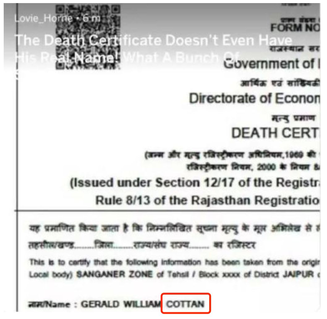 首先是死亡证明。据《名利场》杂志报道,在印度这样一个很容易获得伪造文件的国家里,私人医院在科顿的死亡证明上竟然拼错了他的名字,这份证明的可信度值得怀疑。