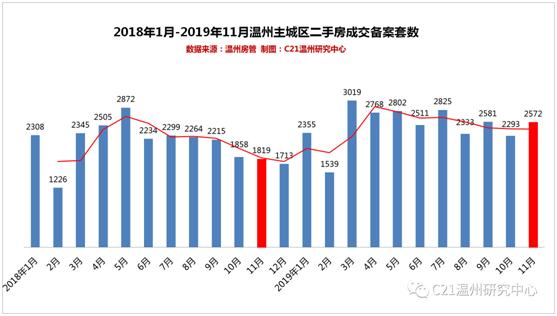 在二手房市场方面,温州市场量价齐升。据C21温州研究中心数据,今年11月份温州市区(鹿城、瓯海、龙湾/经济技术开发区)二手房交易备案套数为2572套,环比上升12.16%,同比上升更是高达41.39%。二手房成交量涨价升,成交均价环比上月涨幅达4.35%,同比去年涨幅10.21%。