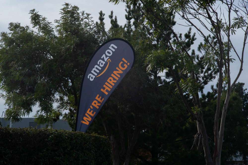 加州旧金山南部亚马逊工厂正门附近的招聘标志