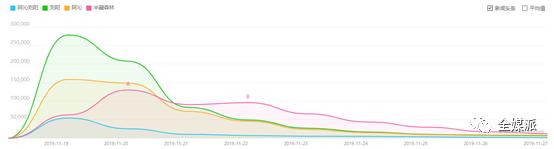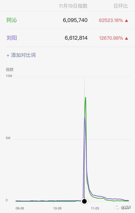 陡然飙升的还有微信指数。11月19日前,两位核心当事人的指数分别徘徊在5000和40000左右。19日当天,数据呈现出百倍的增长,双双超过600万。