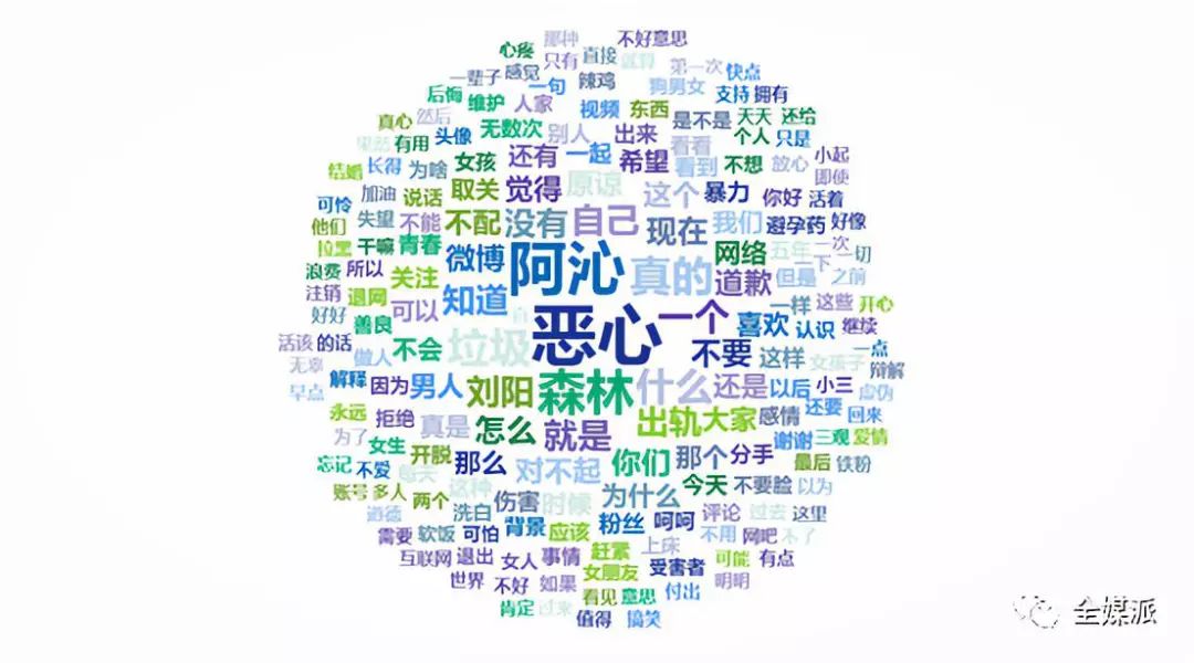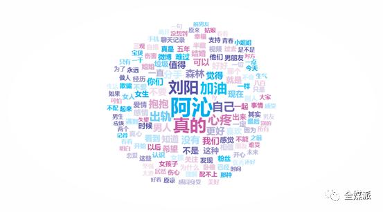 为了更清晰地了解这个问题,我们把新浪微博#阿沁刘阳分手#话题下1500条文本内容过滤重复数据,将使用出现频率在10次以上的词生成词云图,结果如下: