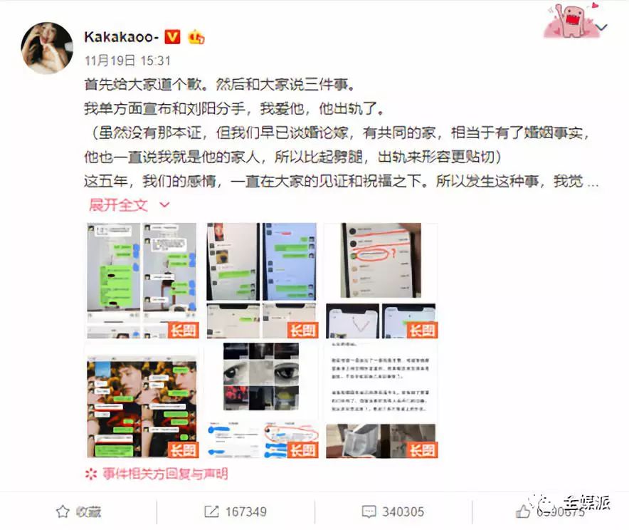 11.19下午 阿沁发文宣告分手,文中指出刘阳与熟人出轨