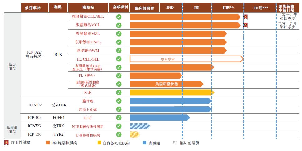 公司管线中三种处于临床阶段并涵盖了主要癌症适应症且具有潜力成为同类最佳及首创的肿瘤候选药物包括:奥布替尼(酪氨酸激酶(BTK)抑制剂)、ICP-192(泛成纤维细胞生长因子受体(泛FGFR)抑制剂)及ICP-105(成纤维细胞生长因子受体4(FGFR4)抑制剂)。
