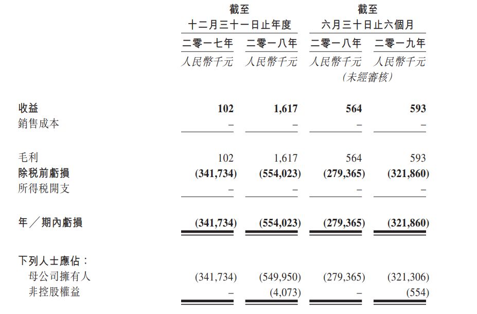 财务资料显示,目前,诺诚健华的产品尚未获准进行商业销售,尚未从产品销售产生任何收益。自成立以来的各年度内持续产生经营亏损,截至2017年、2018年以及2019年上半年,诺诚健华分别实现营收10.2万、161.7万和59.3万元人民币,对应净亏损3.42 亿、5.54 亿与3.22 亿元人民币;研发开支分别为6290万元、1.497亿元与9480万元。
