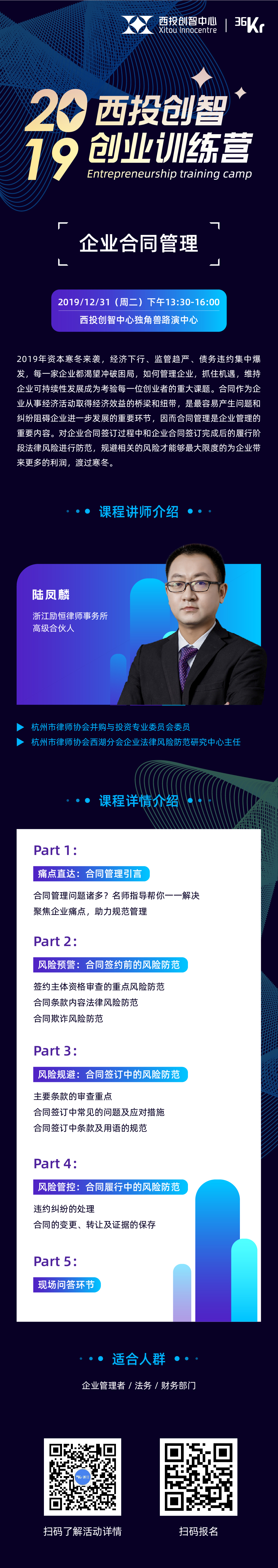 12月31日下午,西投创智中心将举行2019西投创智创业训练营,首期授课老师浙江励恒律师事务所高级合伙人陆凤麟,带来《企业合同管理》相关课程。