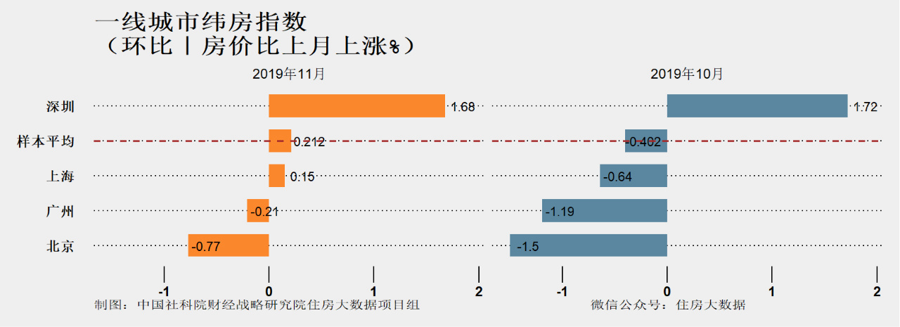 《报告》称,一线城市纬房指数监测显示,自2019年7月以来,一线城市房价走势出现分化,深圳房价独自持续上行,而北京、上海、广州等城市继续调整。其中,北京房价下调速度要快于其它一线城市。