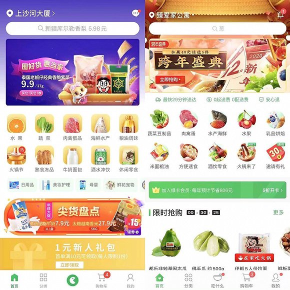 朴朴超市(左)与叮咚买菜(右)的APP界面对比