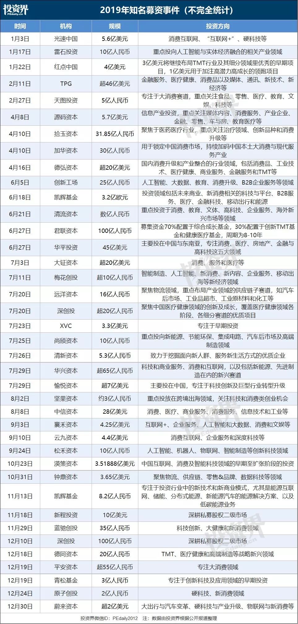 事实上,不少知名机构都在2019年逆势成功募集了新基金。投资界(ID:pedaily2012)根据公开信息,梳理了2019年那些知名的募资事件(不完全统计)。